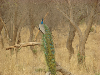 Now here in India they are found everywhere but more so in the open areas in South Delhi where I live. They play hide and seek in the bushes at the back of my house, they strut along the pathways chicks in tow. They perch on the fences and cry ferociously and infuriatingly and they dazzle daily with their feathers.They are mainly blue and green here but white peacocks also exist. The colours result from the micro- structures of the feathers and way light falls on them. Male birds have the upper hand here as you know and perhaps like most things male it is a carefully constructed and thought out plan- the goal is clear- to get the woman.