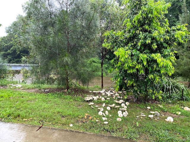 Further down the path the water rising rapidly and mushrooms loving it.